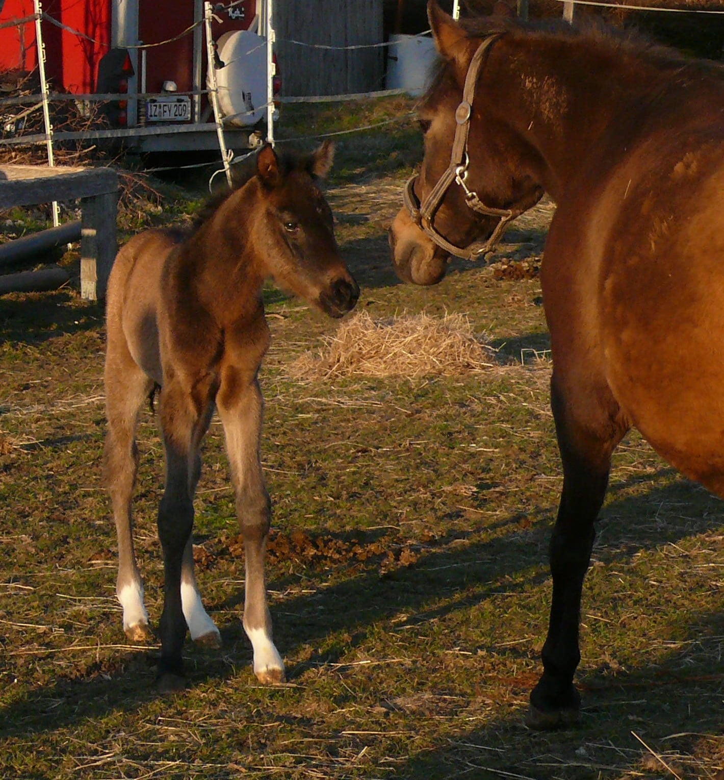 Farblich mag ich noch nicht raten, es kann Grundfarbe braun oder schwarz sein, mit oder ohne Cremegen. 2018 dachte ich, sie hätte ein braunes Stutfohlen bekommen, dass dann zu einem fast schwarzen Buckskin wurde. Das war heller als er bei der Geburt.